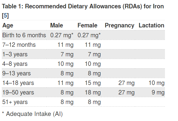 Recommended Dietary Allowances (RDAs) for iron intake vary based on age and, for women, pregnancy status (PSA: these recommendations were developed by the Food and Nutrition Board (FNB) at the Institute of Medicine (IOM) of the National Academies (formerly National Academy of Sciences)).