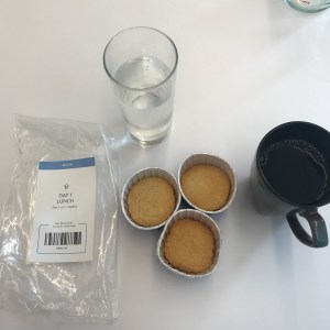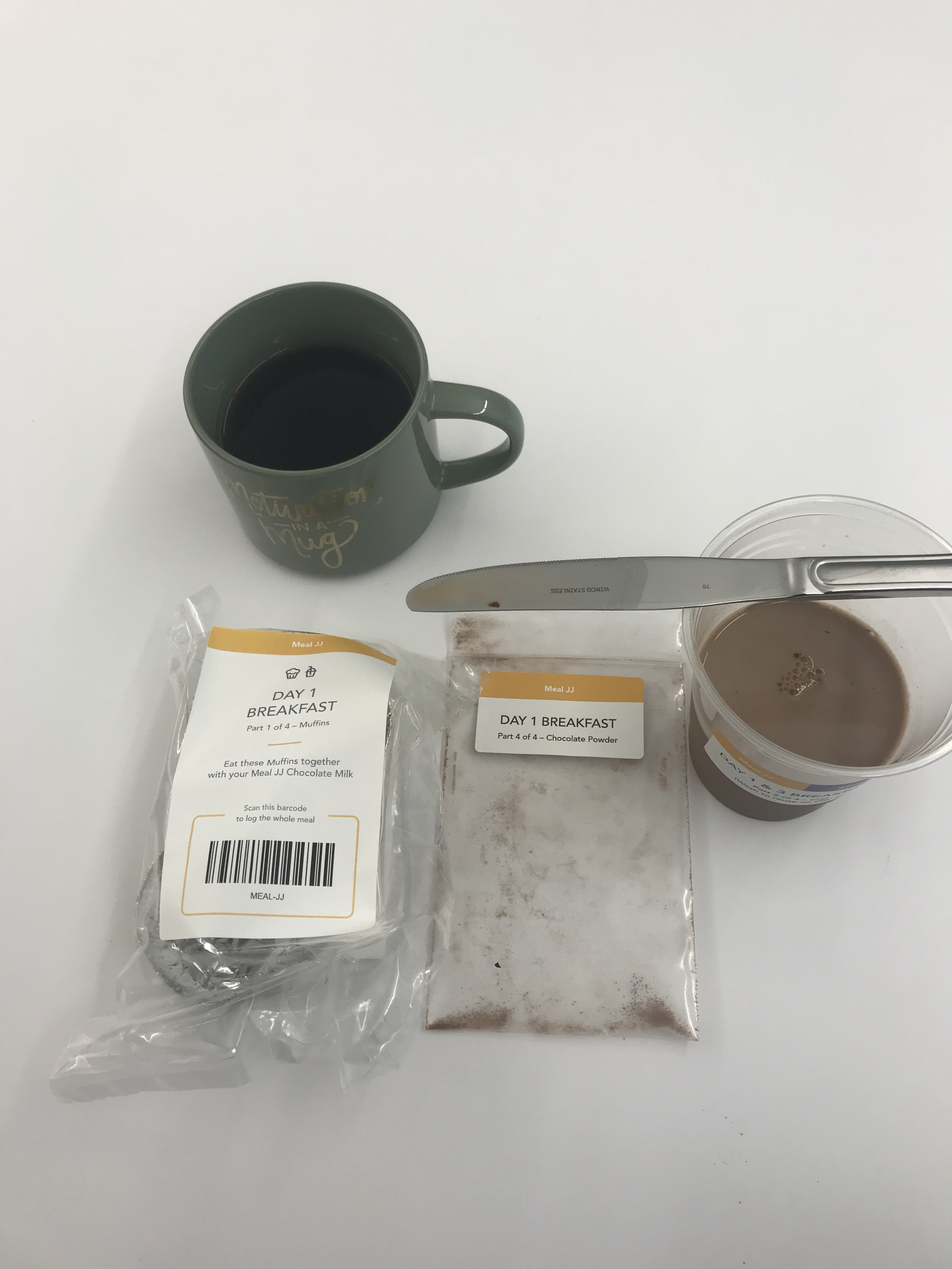 My breakfast for day 1 was two semi-sweet, dense muffins just a bit larger than golf balls and what looked like about one cup of chocolate milk (milk I received from the study pack mixed with brown chocolate powder, also from the study pack). I had to finish the meal in less than 15 minutes and record the exact time I began eating. After I had eaten a few bites of the muffin, I was able to have coffee or tea – plain – and I chose coffee.