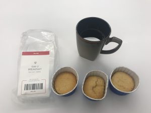 I had my day 2 breakfast at 8:03am, consisting of three standardized muffins, looking and tasting the same as the muffins from day 1. I also had a cup of coffee, which I logged in the study app.
